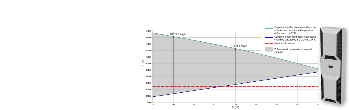 Il compressore compatto con la sua velocità variabile, può essere impostato per fornire solo la potenza frigorifera effettivamente necessaria. La regolazione costante garantisce un livello di temperatura molto costante all'interno dell'armadio e quindi un minore stress per i componenti elettrici e il gruppo frigorifero.
